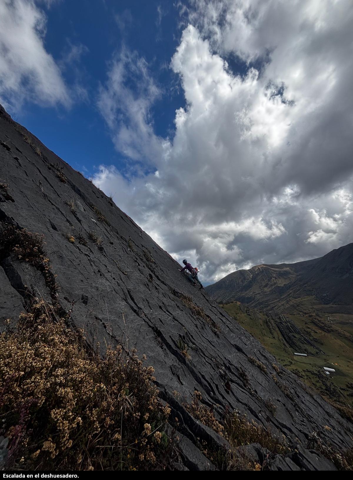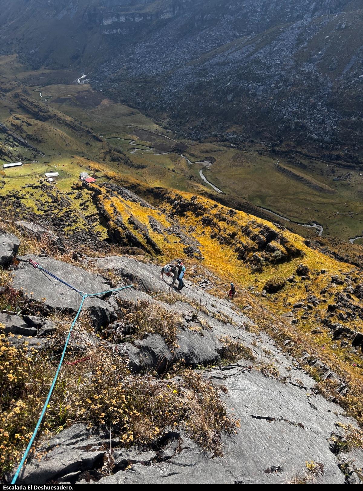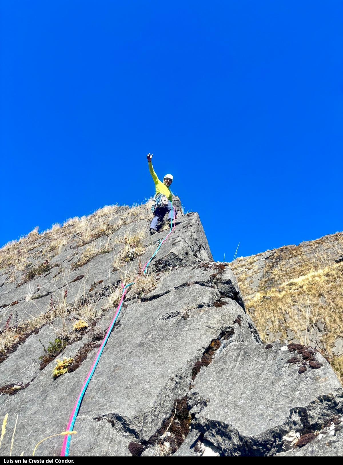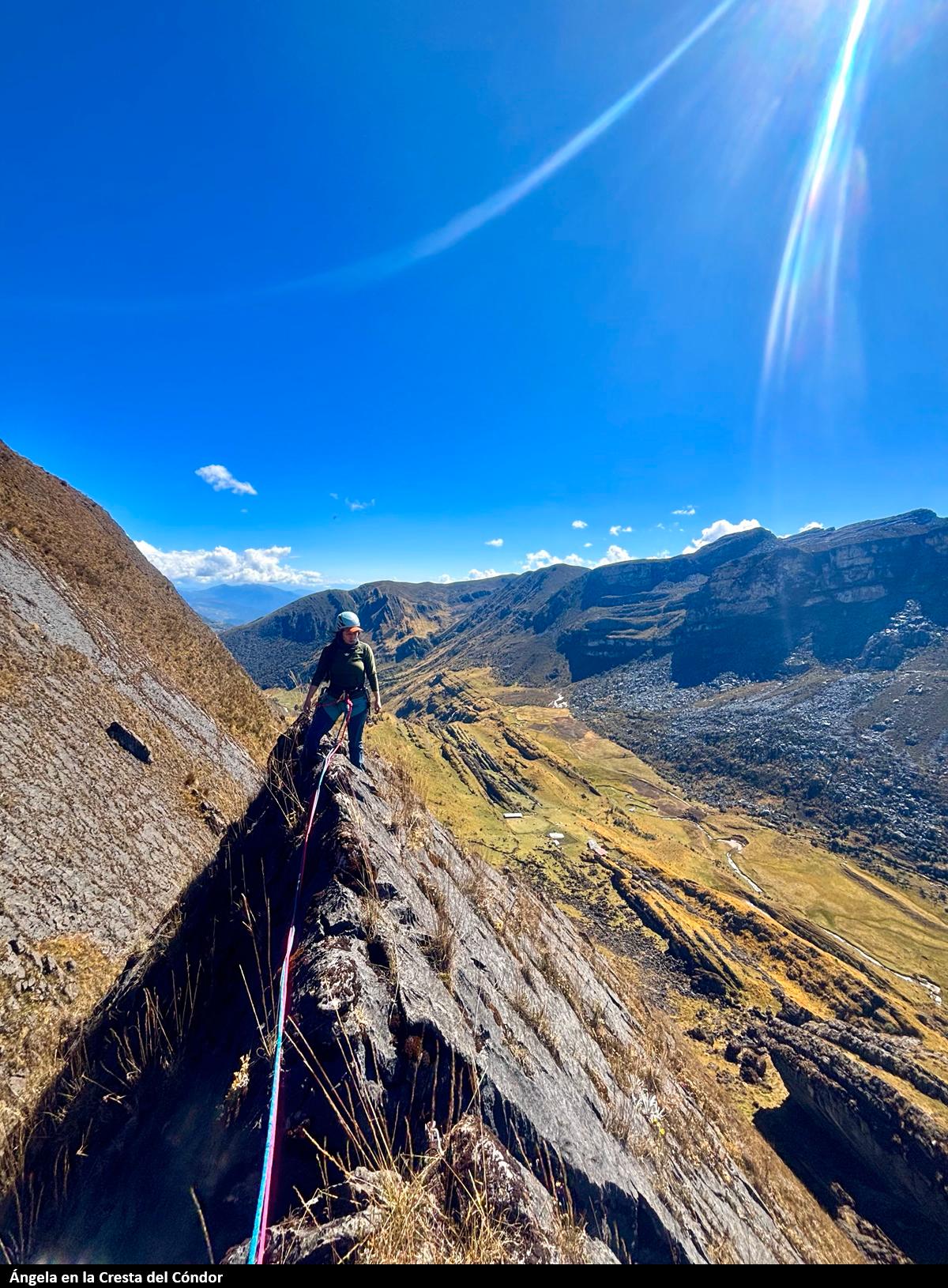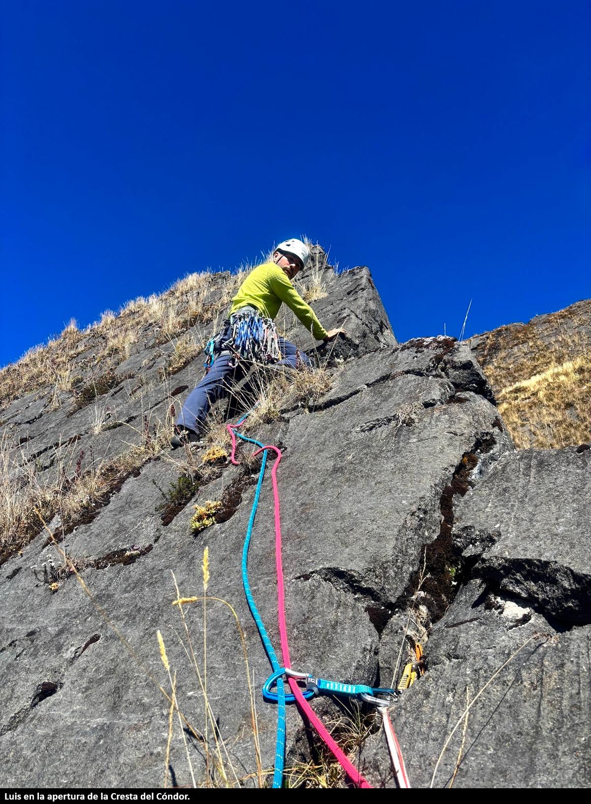 Con un juego sencillo de seguros móviles nos adentramos en la pared que, sin ser del todo vertical, sí daba la sensación de vacío a medida que escalábamos. Al principio la cresta es un tanto redondeada, lo que permite escalar justo sobre la cresta, o quizás en un lado u otro de la misma; así durante los dos primeros largos. Luego, una gran repisa permite solo caminar horizontalmente para mover la reunión unos 70 metros para situarse a la izquierda de la zona desplomada en toda la mitad de la pared, y que pareciera un gigantesco mordisco en medio de la arista. Y al final, esta segunda mitad, transcurre por la zona más afilada y estética de la cresta, tanto así que algunas secciones se pueden superar pasando una pierna por cada lado de la arista, tal y como montando una silla de caballo. Allí, gracias al buen clima, la amplia y lejana visibilidad y el paisaje vertical, logramos unas bonitas fotos de Ángela haciendo equilibrios sobre una de las puntas de la cresta. La cumbre, siendo bastante alta y aérea, no resulta ser tan fotogénica como esta sección de la afilada arista. Sin embargo, en la cima tomamos las fotos de rigor y descansamos por un rato mientras yo aprovechaba para estudiar la ruta de ascenso al Pico La Colorada, que estaba detrás del Deshuesadero y a la que nos dirigiríamos el día siguiente. La ruta nueva luego sería bautizada como “La Cresta del Cóndor”.