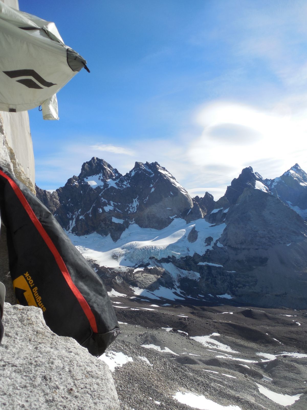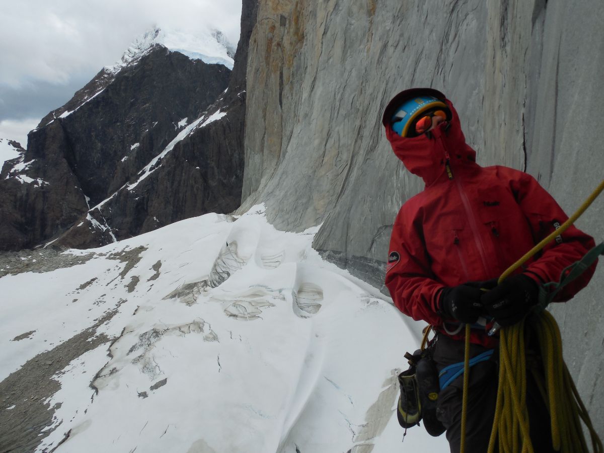 La pared es bastante vertical, por esta razón la nieve nos se acumula, así que tuvimos una interesante jornada de petateo (incluyendo casi 30 Litros de Agua) a nuestro “Balcón”. Una interesante jornada de resistencia que nos tomo un día completo.