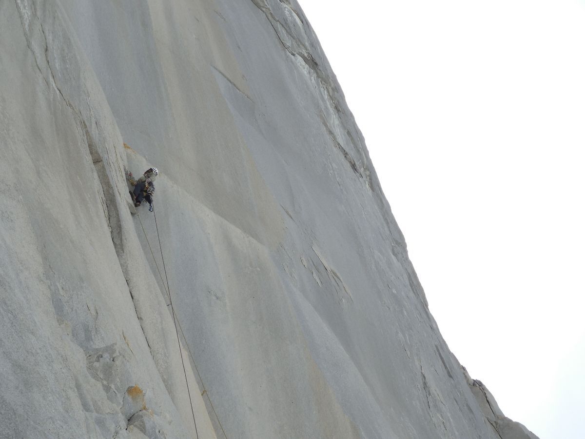 Aunque probamos muchos de los largos en “libre”, exceptuando el largo 3, no tuvimos suerte con nuestro plan original, las intensas jornadas de aproximación y petateo pasaron la cuenta después de todo, además Fabián, después de una caída de aproximadamente 5 metros quedó sin posibilidades algunas de cualquier intento de escalar en Libre.