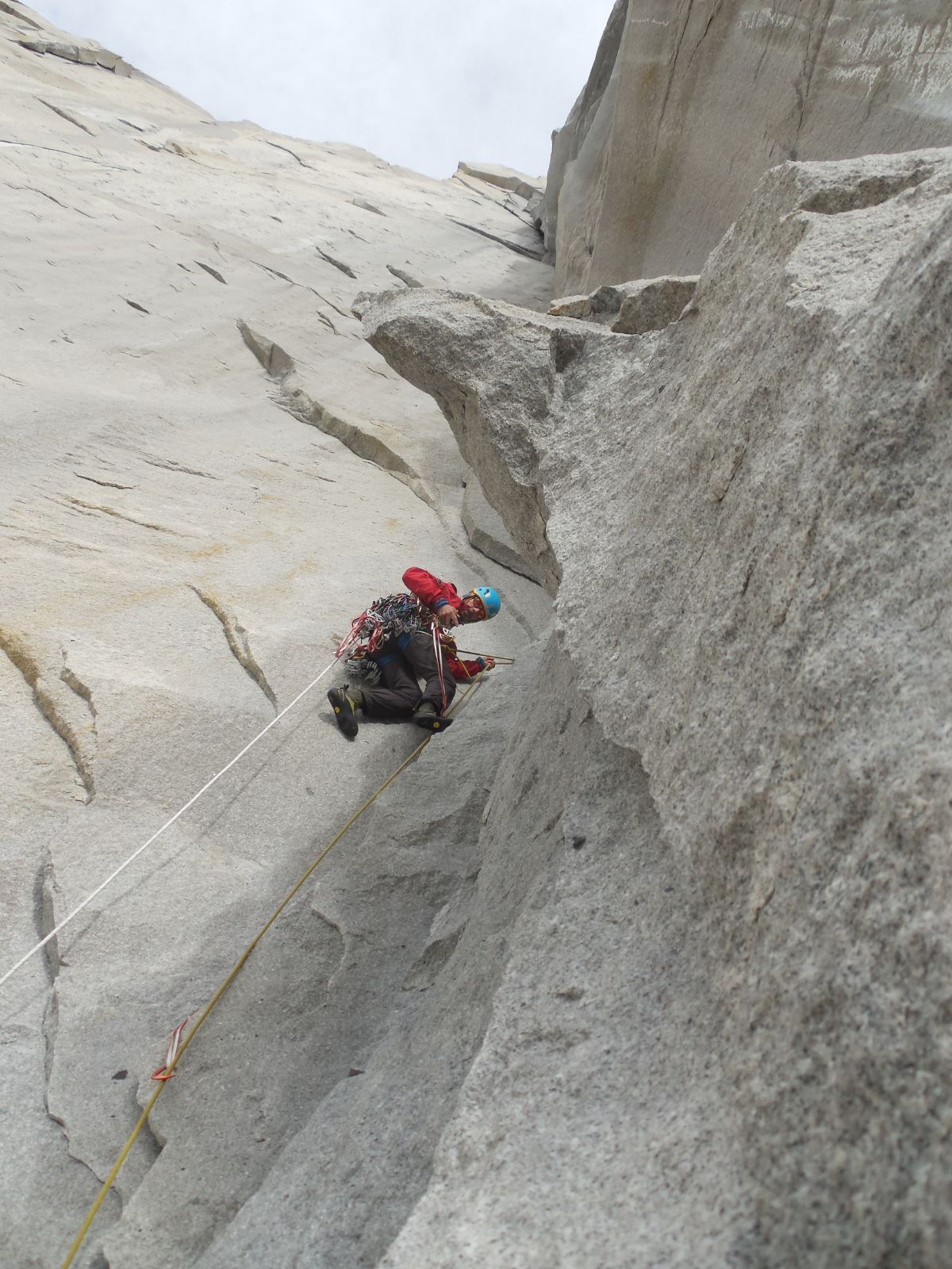 Comenzamos a escalar en estilo capsula en enero 29, después de aproximadamente 2 semanas fijando 250 metros de cuerda hasta el largo 7, donde los 3 estuvimos por 7 noches en una sola hamaca para 2 -Difícil de creer pero tuvimos algo de espacio extra!-