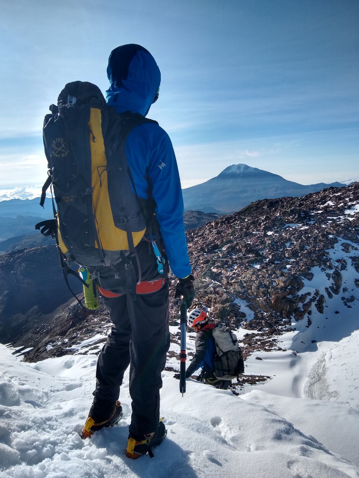 Seguidamente descendemos a un gran collado que ha quedado entre la cima centro y sur, la cual se convierte en la cima que nos toma mayor tiempo, pues los efectos de los procesos mecánicos de fractura de la roca hacen lo suyo en las alturas y nos encontramos con un escenario donde todo está descompuesto, así que nos aproximamos con cautela y con espacios prudentes entre cada uno de nosotros. La cima sur se hace cada vez más pendiente y un poco riesgosa en función de algunos desprendimientos, sin embargo, es posible acercarse con mesura. En sus últimos 10 metros hay algo de nieve y se forman “neveros” bastante inestables, es el glaciar agonizando. Demoramos hora y media desde el descenso en rappel desde la cima centro. Nos olvidamos del cronómetro, preparamos café y seguimos disfrutando del momento.