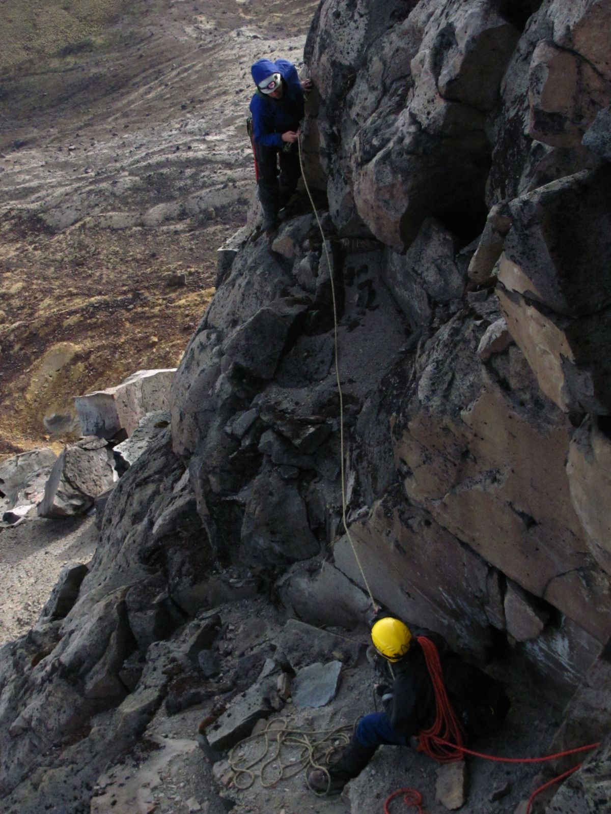 De aquí, se puede seguir a la cima siguiendo la ruta normal occidental si se desea. El tiempo es de 6-8 horas, y se requiere un pequeña selección de fisureros y cintas para el primer tramo y el rappel.