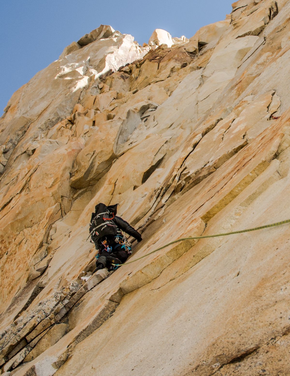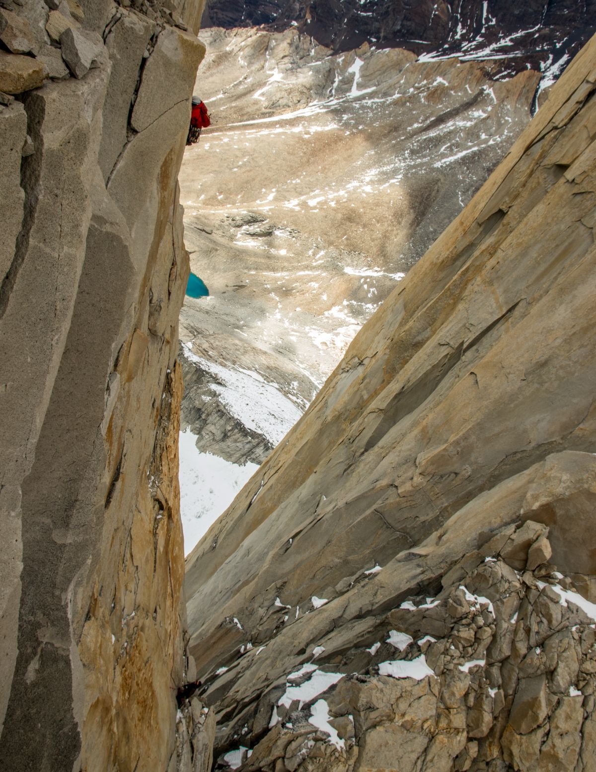 torres del paine 03Durante el largo crux de la vía Monzino en la Torre del Paine. Abajo el Col Bich separa las caras este y oeste.
