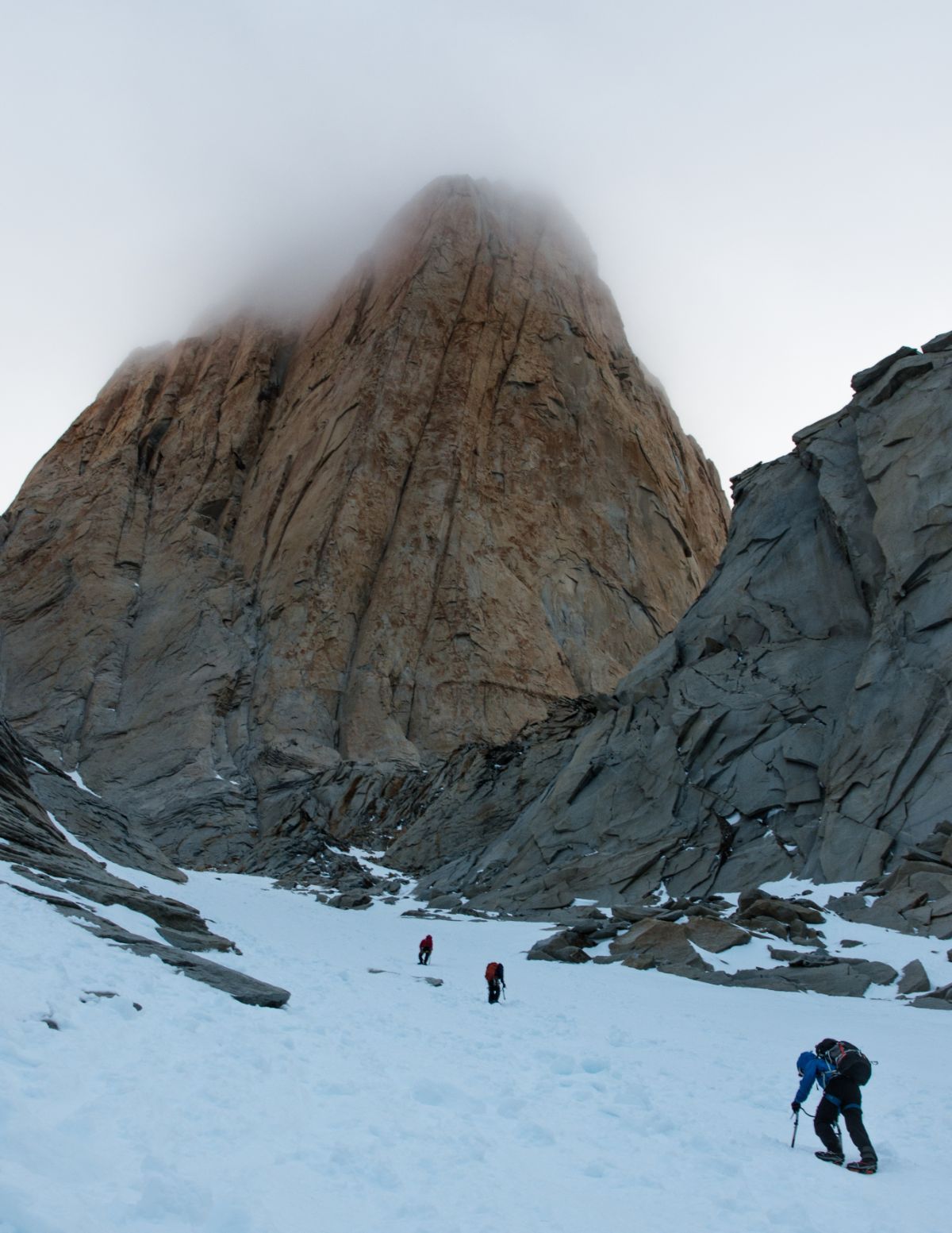 El día llegó, veíamos que habría una tregua de 1 día, era nuestra oportunidad. Mochila al hombro nos internamos en el Valle del Silencio con la ilusión de encontrar las paredes practicables. Dormimos en la Cueva Bonington y muy de madrugada asediamos la Torre Norte del Paine a través del corredor de hielo que lleva al Col Bich. El clima estaba inestable: noche ligeramente estrellada y amanecer nublado, aún así emprendimos los largos de hielo y mixto sin reparar en el clima hasta que el frío intenso de casi 10 grados bajo cero nos hizo recapacitar. Afortunadamente la motivación fue más fuerte que el viento y continuamos escalando en medio de inmisericordes ráfagas de viento que amenazaban con arrancarnos de la pared y llevarnos como hojas secas hacia las aguas del Estrecho de Magallanes.